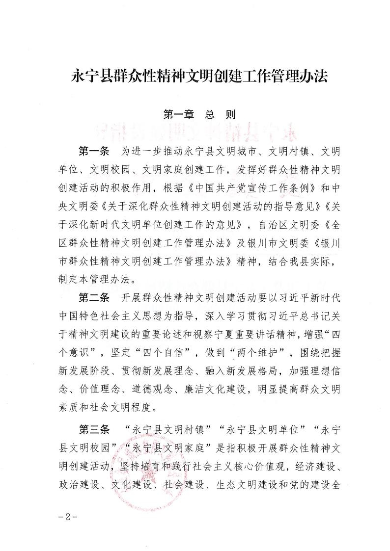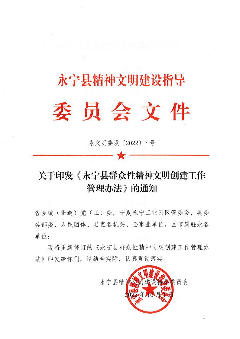 關(guān)于印發(fā)《永寧縣群眾性精神文明創(chuàng)建工作管理辦法》的通知---寧夏永寧文明網(wǎng)