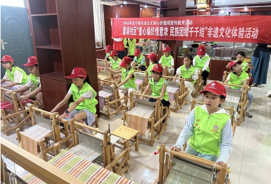 文化傳承,非遺工坊的匠心之旅。在原隆村非遺工坊,手鞠球、泥哇嗚、麻編織品、虎頭鞋、刺繡品等豐富多彩的非遺制品便吸引了孩子們的目光。這些精美的手工藝品,每一件都蘊含著深厚的文化底蘊和精湛的技藝?!斑@些非遺制品都是原隆村各族婦女們手工完成的,不僅做工時間地點靈活,還能增加家庭收入,提升生活水平?!狈沁z傳承人劉奶奶娓娓道來,并向孩子們自豪的講述:“是閩寧協(xié)作讓寧夏南部山區(qū)的村民搬出了大山,擺脫了貧窮,走上了康莊大道。”在劉奶奶的指導下,孩子們坐在織布機前,有模有樣地嘗試著織布。雖然動作生疏,但每一個孩子都全神貫注,臉上洋溢著專注和喜悅。非遺文化在孩子們手中綻放出新的光彩,傳承的種子在他們心中悄然生根。