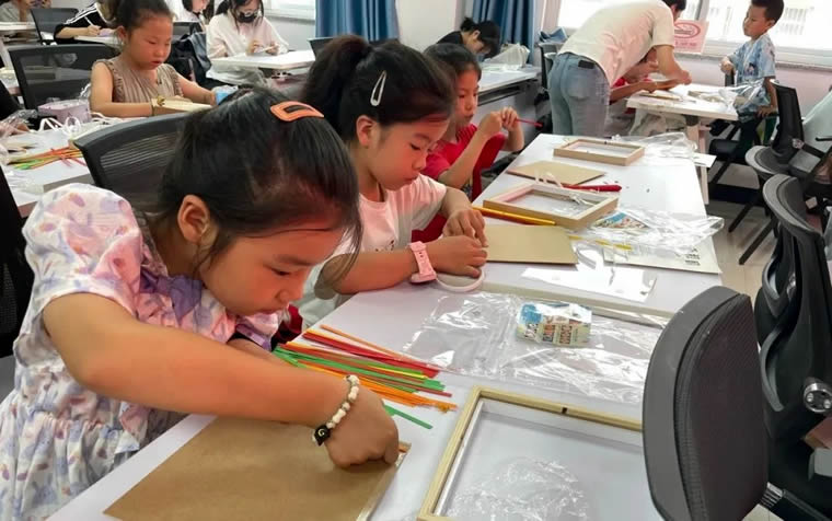 在備受期待的愛國主義竹編畫制作環(huán)節(jié),社區(qū)提前準(zhǔn)備了竹篾、彩線、相框等豐富材料。大學(xué)生志愿者與孩子們一對一結(jié)對,耐心細(xì)致地手把手教學(xué)竹編基礎(chǔ)技巧。孩子們圍繞“盛世中華”“我愛祖國”“五角星”等充滿正能量的元素展開構(gòu)思,靈巧的雙手在竹編間來回穿梭,彩線在指尖逐漸勾勒出一幅幅形態(tài)各異卻同樣飽含深情的作品。“這是我編的五角星,雖然還不夠完美,但每一根線都代表著我對祖國的愛!”青少年李嘉駿高高舉著自己的作品,臉上洋溢著自豪的笑容,眼中閃爍著真摯的情感說道。
