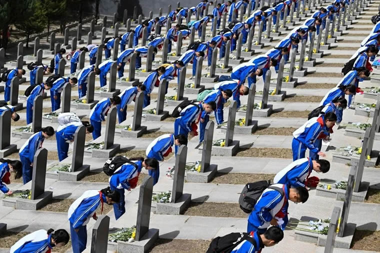 4月3日,在任山河烈士陵園,學(xué)生向烈士墓碑鞠躬。新華社記者 馮開華/攝