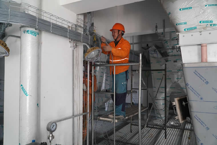 11月4日,在永寧縣閩寧產(chǎn)業(yè)園寧夏山海飼料有限公司12萬(wàn)噸反芻飼料項(xiàng)目建設(shè)現(xiàn)場(chǎng),工人正在進(jìn)行電線布控、安裝照明及工程消缺等細(xì)節(jié)施工?,F(xiàn)場(chǎng)負(fù)責(zé)人王海波介紹,項(xiàng)目建設(shè)已進(jìn)入收尾階段,預(yù)計(jì)本月上旬完成竣工驗(yàn)收,中旬對(duì)機(jī)械設(shè)備進(jìn)行聯(lián)機(jī)調(diào)試,12月底計(jì)劃投產(chǎn)。